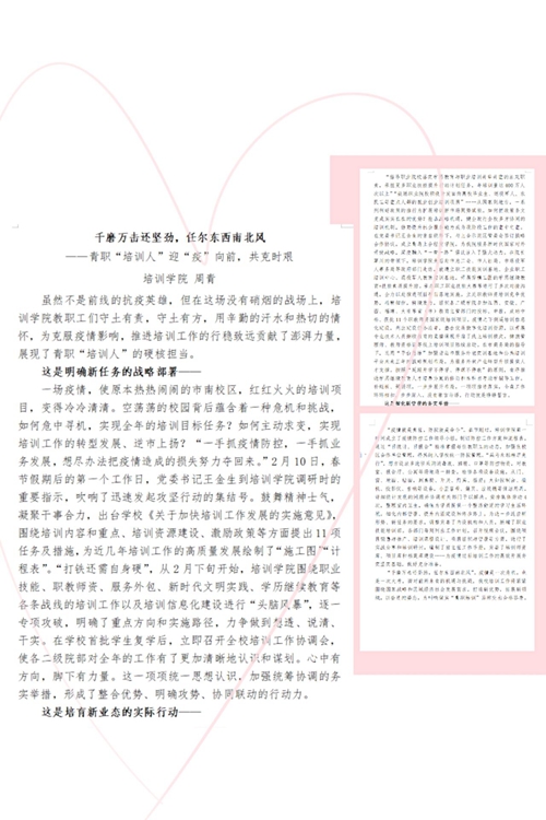 近日,由学校党委组织部主办、信息学院党总支承办的“红动青职”系列活动之“共抗疫情你我力行”主题征文比赛顺利举办。此次比赛面向全体师生党员及入党积极分子,以线上提交作品的形式进行。