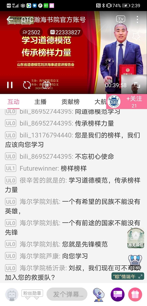 6月26日,海尔学院党总支举办“道德模范进校园”之山东省道德模范刘洪海事迹宣讲报告会,第七届山东省道德模范刘洪海通过哔哩哔哩APP开启“云端”直播。海尔学院全体师生、长江路街道峨眉山路社区党委等社区学院共建单位2000余人共同收看报告会。报告会由海尔学院团总支书记丁志健主持。