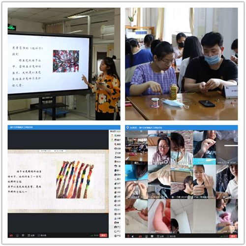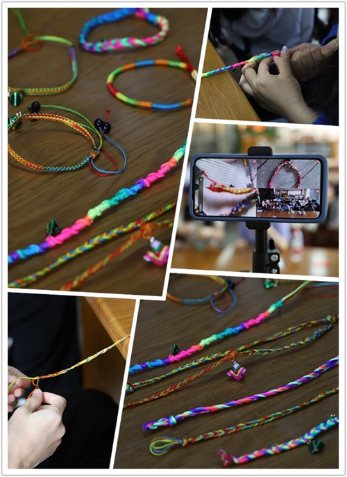 五彩编绳制作体验活动以线上线下同步体验的方式进行,团队负责人讲解了五色丝线的观念象征以及避邪驱瘟、祈福纳吉的美好寓意,示范了编织绳结的基本手法。在体验编织环节,大家积极交流技法,伴随悠扬的古乐,在同学们一双双巧手下编织出了独出心裁的纹样和图案,制成了各式各样的腕绳、配饰、挂饰,传递了传统节日的浓厚情意。