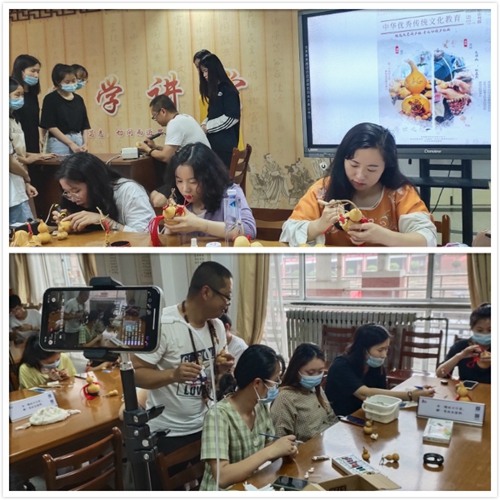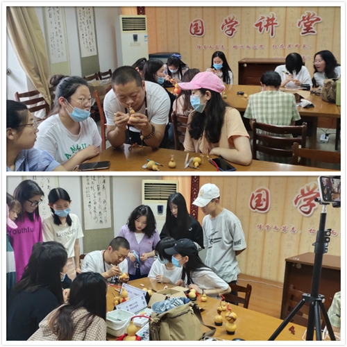 活动的第二环节是由张连杰带领现场以及通过艺馨天地抖音平台观看直播的学生们进行烙画体验。他向同学们讲解了如何根据葫芦的外形进行图案设计,如何根据葫芦皮类别进行烙画工具的选择与调试,并向同学们展示了如何通过连贯流畅的线条、浓淡深浅的上色、明暗强弱的层次,使葫芦成为一个个集拙朴自然和高雅精美为一体的艺术品。张连杰表示,在葫芦的设计与制作过程中所需的图案设计的创造性和坚韧的毅力需要更多的自我培养和磨练,需要真正的静心刻苦钻研。