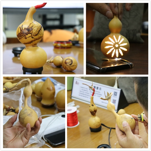 此次活动的第一环节是由青岛市民间文艺家协会、青岛市手工艺协会张连杰围绕“葫芦在中国传统文化中的内涵”“东昌葫芦雕刻第二批国家级非物质文化遗产”“葫芦烙画的技艺技法”“葫芦文创衍生品的设计与制作”4个主题作讲座。张连杰阐述了“烙铁为笔,高温为墨”的烙画葫芦是一种有民间特色的传统工艺美术品,“烙画艺术不是固定的,是流动的,多面的,灵性的”,需要创作者根据葫芦的自生形态,通过构思立意、艺术加工及工艺处理,按照技法来烙画,创作艺术形象作品等观点。
