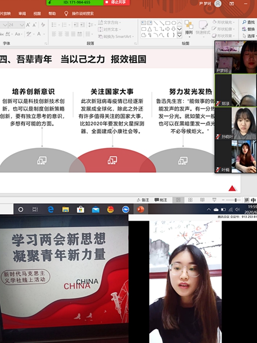 活动中,各社团紧紧围绕活动主题,开展了一系列形式多样、内容丰富的线上活动。其中,新时代马克思主义研学社围绕两会精神组织开展了“学习两会新思想,凝聚青年新力量”主题线上分享交流会;社交礼仪社组织开展了“学习新思想,争做新青年”主题网上研讨会,分享学习了中国青年五四奖章获得者的先进事迹;英语试听社、HRO新蓝德中心社等社团围绕疫情防控工作中涌现出的先进典型事迹进行了分享交流。哈哈曲艺社、大学生合唱团、知音艺术吉他协会、民族舞社等社团结合疫情防控过程中的感人事迹,以“一路同心、携手同行”为主题,进行了歌曲、舞蹈、微视频的录制,以同学们喜闻乐见的方式向疫情防控中的英雄们致敬,弘扬社会正能量。书法社以“抗疫抒怀、翰墨传情”为主题组织了书法作品征集活动,让社团成员通过手中笔墨为抗疫加油助力。