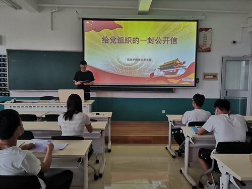 6月21日,信息学院学生党支部在修能楼505组织开展了“叩问初心,给党组织的一封公开信”主题党日活动,2018级学生预备党员参加了此次活动。