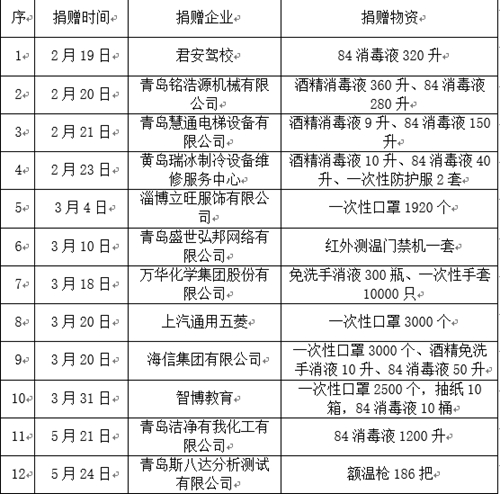 青岛铭浩源机械有限公司、上汽通用五菱、万华化学集团股份有限公司、青岛斯八达分析测试有限公司、海信集团有限公司等12家合作单位和爱心企业累计向我校捐赠84消毒液2090升、酒精消毒液379升、一次性口罩7420个。合作单位和企业捐赠的物资不仅充实了学校防疫物资的储备,也将联合抗疫、共克时艰的信心播撒在了师生心间。学校将根据防疫工作总体安排,统筹做好口罩、消毒液、防护服、测温仪等防疫物资的调配使用,切实守护师生的健康与安全。