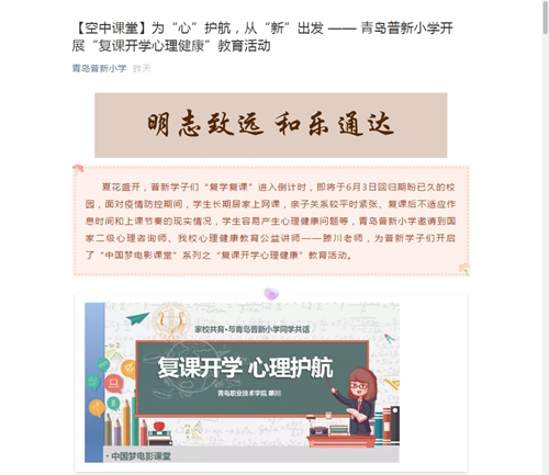 6月3日,应青岛普新小学邀约,“中国梦电影课堂”为普新小学新开学的学生们开展了一期“复课开学·心理护航”专题讲座。