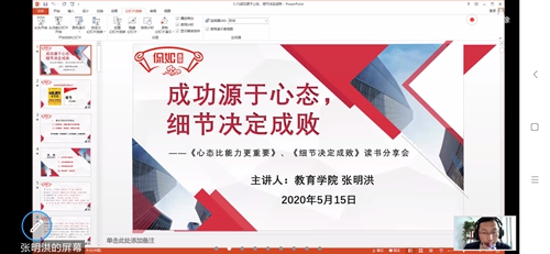 5月15日,侃如书院邀请党员导师、教育学院党总支副书记张明洪做客侃如书会,开展“成功源于心态,细节决定命运”主题线上读书分享会。