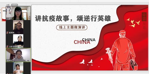 活动中,同学们紧扣演讲主题,用简单质朴的语言讲述了逆行英雄的抗疫故事,分享了抗“疫”期间的所见所闻所想,以及发生在自己身边的暖心事迹,表达了对所有奋战在抗疫一线的医务工作者的感恩,弘扬了逆行英雄们敬佑生命、救死扶伤、甘于奉献、大爱无疆的崇高精神。此次活动以线上演讲的方式进行,同学们充分准备,演讲中慷慨激昂、豪情满怀,感染着每一位听众。