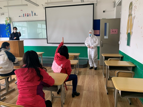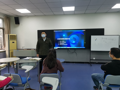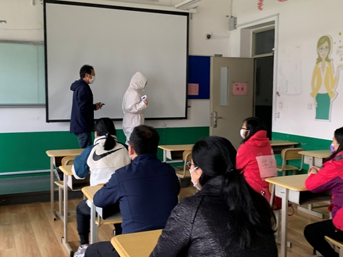 5月9日上午,旅游学院首批返校的22名教师在闻道楼130教室进行了应急防控演练专项培训,并邀请了6名相关公寓管理员一同参训。