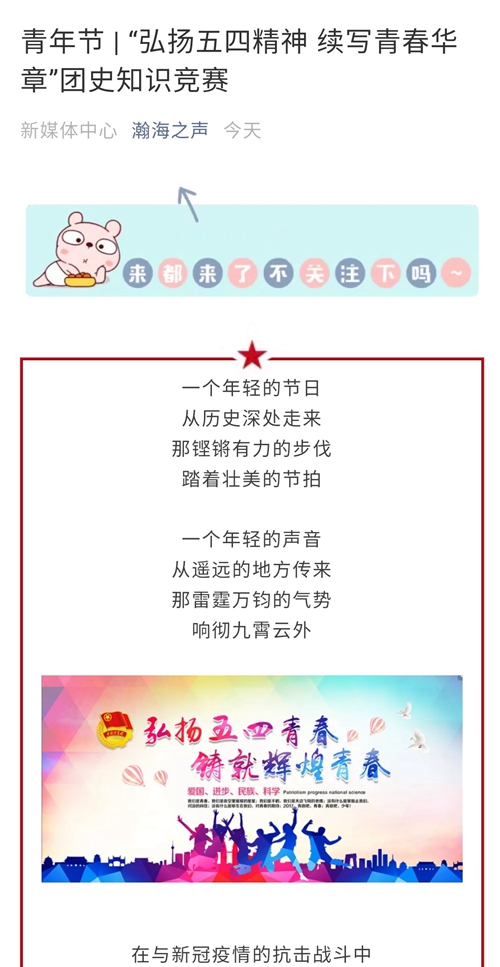活动以“瀚海之声”微信公众号为载体,采用线上答题模式开展,知识竞赛内容聚焦习近平总书记在纪念五四运动100周年大会上的讲话精神、关于疫情防控工作的系列重要讲话精神和指示批示精神、给北京大学援鄂医疗队全体“90后”党员的回信精神及关于青年的系列重要讲话精神,党的十九大精神以及团的历史、团的基础知识、团章及共青团十八大报告等方面的知识。此次活动共收到有效答卷700余份,综合正确率和答题效率,按照得分从高到低排名,评选出一等奖2名,二等奖3名,三等奖5名。