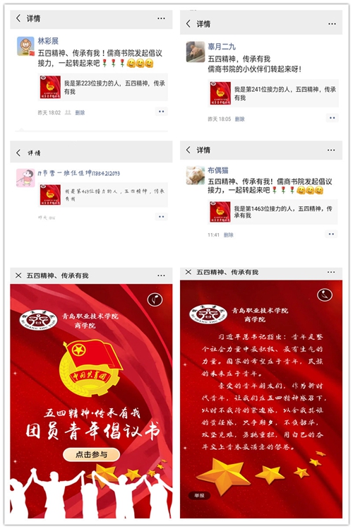 商学院团总支以H5形式向全体团员发起“五四精神·有我传承”团员青年倡议接力活动,号召全体团员牢记青春使命、勇挑时代重担,以青春和奋斗书写青春的美好华章。截止目前,超过1400名团员转发参与此次接力。