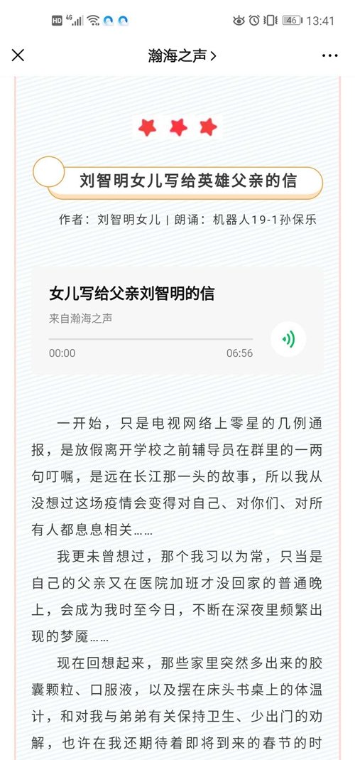 在瀚海之声微信公众号上发起的“战疫有我共赴时艰,佳音传情同读家书”《瀚海朗读者》活动中,同学们还特地诵读了原武昌医院院长刘智明女儿刘洋写给英雄父亲的家书,借此深切哀悼在抗击新冠肺炎疫情斗争一线牺牲的烈士,表达对战“疫”英雄的无限崇敬之情、怀念之思、感恩之心。