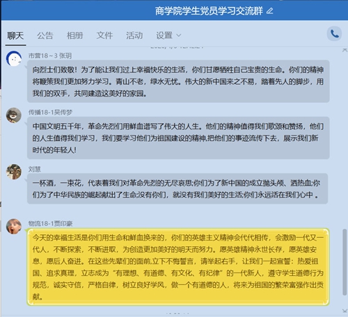 学生党员群内交流对先烈的缅怀和追思