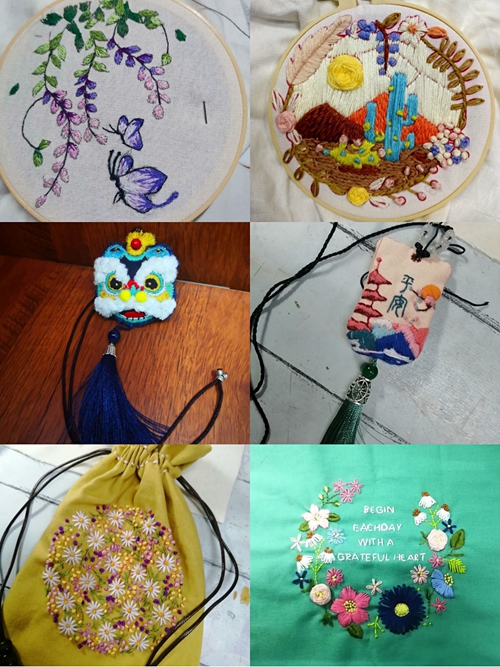 活动伊始,活动相关负责人为同学们讲解了刺绣工艺起源、民间刺绣种类、绣法风格以及对于初学者刺绣的针法使用。活动中,同学们静心刺绣,通过绘样、配线、上绷、绣制等多种针法和多色绣线在绣花绷上绣出了趣味生动、栩栩如生和极富诗情画意的作品。此外同学们还发挥创意,将刺绣作品制成随身镜、手包、扇子、香囊、摆件等,让空白的织物被赋予灵感,变得兼具艺术性和实用性。