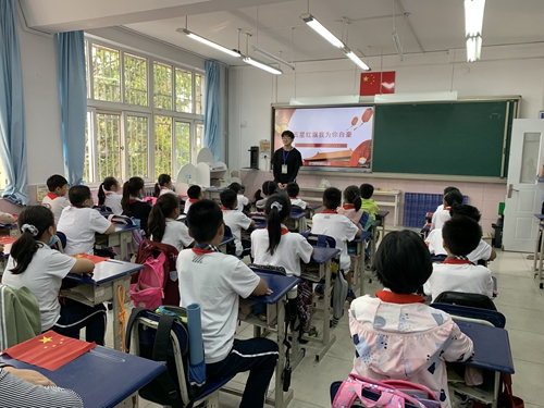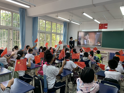 活动中,宣讲团成员通过《建国大业》电影片段,让学生们了解了新中国成立前夕国旗选择的历史故事以及国旗的由来,通过“开学第一课”视频介绍了革命先辈们为新中国的成立抛头颅、洒热血的感人故事,引导同学们思考国旗对每个中国人的意义。宣讲团成员还通过介绍2019年保护国旗的感人瞬间,引导学生们将祖国发展与个人发展结合起来,用自己的实际行动保护国旗。课程最后宣讲团成员与学生们共同唱起了歌曲《红旗飘飘》。