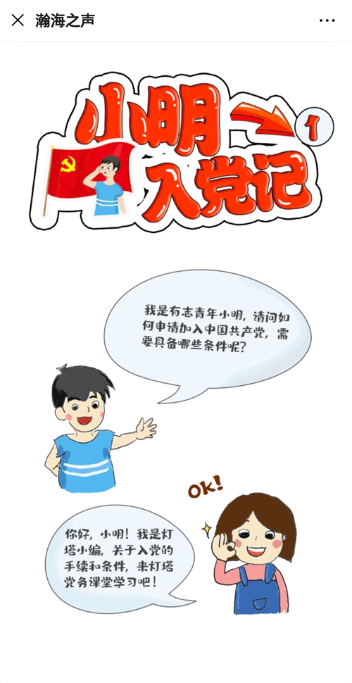 海尔学院党总支积极拓展线上教育途径,利用“瀚海之声”微信公众号,通过“小明入党记”这一形象生动的方式发布入党指南,介绍入党流程、入党条件等,将入党启蒙教育采用青年学生喜闻乐见的形式融入到新生日常生活,拉近新生与党组织之间的距离,为新生在政治上的进步指路引航。