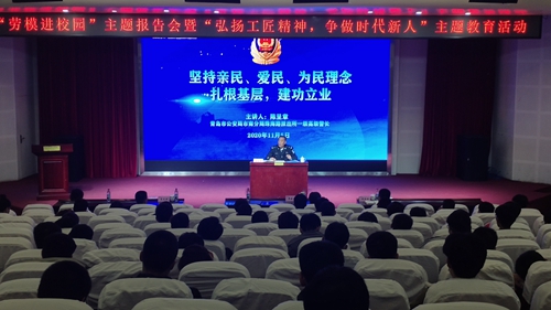 11月5日,“劳模进校园”主题报告会暨“弘扬工匠精神,争做时代新人”主题教育活动在学校艺术厅举行。全国优秀人民警察、青岛市劳动模范,青岛市公安局市南分局珠海路派出所一级高级警长陈呈章为师生作“坚持亲民、爱民、为民理念,扎根基层,建功立业”专题报告。海尔学院党总支书记费晓玉、党总支副书记杨春旺,制冷与空调技术专业教授、全国技术能手李元超以及海尔学院全体党员、师生代表300余人参加了报告会。活动由海尔学院团总支书记丁志健主持。