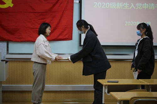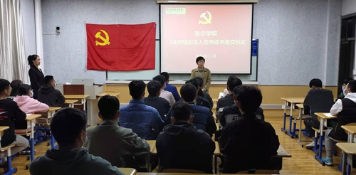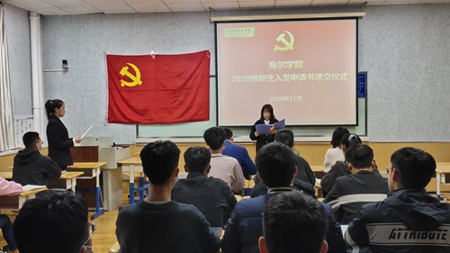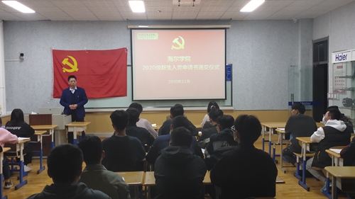 11月10日晚,海尔学院党总支在致用楼教室举行2020级新生入党申请书递交仪式,海尔学院党总支书记费晓玉、副书记杨春旺、学生党支部书记冯珍鸽及2020级新生代表参加了仪式。