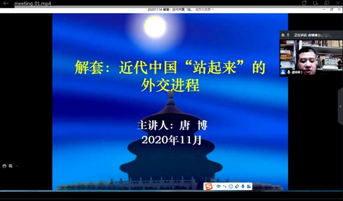 11月14日,教育学院邀请《百家讲坛》80后主讲人唐博博士作“近代中国‘站起来’的外交进程”专题讲座。讲座以线上方式进行,教育学院师生代表以及全体入党积极分子聆听了此次讲座。