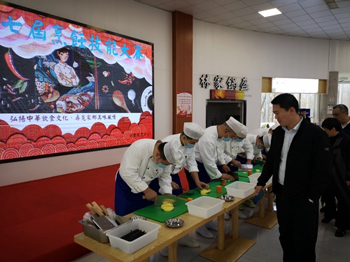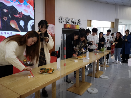 比赛首先进行的是刀工展示,来自学校青职营养餐的7名厨师以土豆切丝和料花(胡萝卜)为展示项目,只见土豆丝细如发丝又均匀,胡萝卜转眼成为花朵、蝴蝶,受到了大家一致好评。随后进行了红案比赛,8组红案家乡菜队伍,现场依次制作家乡菜品,只见一道道家乡美味菜品呈现在大家面前,德州扒鸡形色兼优、五香脱骨、肉嫩味纯;汆汤浮丸肉丸细嫩、汤鲜适口,各评委根据参赛家乡菜品的色、香、味、形等方面进行品尝、评分,最终红案由德州扒鸡队摘得桂冠。最后进行了白案比赛,4组白案家乡菜队伍,经过激烈角逐,最终白案由郓城壮馍队夺魁。活动中,还进行了食品安全和疫情防控知识有奖竞猜、参观食堂后厨等活动,现场吸引了众多学生参与。