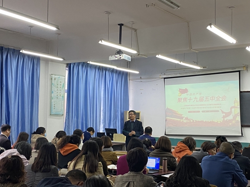 11月19日下午,商学院党总支在闻道楼教室组织开展了“党的十九届五中全会精神”专题学习活动。活动邀请了思政部武文教授作专题讲座,商学院相关负责人及全体教师参加了此次学习,学习活动由商学院党总支副书记薛峰主持。