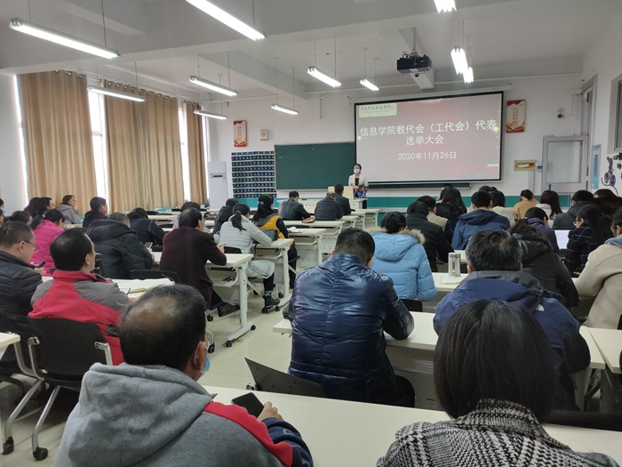 11月26日下午,信息学院分工会于修能楼教室召开了第六届教代会和第五届工代会双代会换届选举大会,信息学院60名教职工参加了会议。会议由信息学院党总支书记李明杰主持。