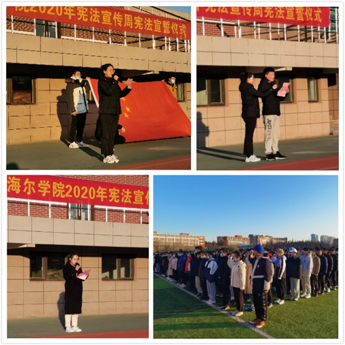 4日清晨,海尔学院组织全体在校生在西操场举办“以青春的名义,向宪法致敬——海尔学院2020年宪法宣传周宪法宣誓仪式”,仪式在奏唱庄严雄壮的国歌声中拉开帷幕,随后,海尔学院学生会主席团成员任艳娜向全体同学发出倡议:学宪法,弘扬宪法精神,坚定法治信仰;懂宪法,增强宪法观念,深化法治实践;守宪法,维护宪法权威,争当法治先锋;海尔学院学生会主席团成员芦康在国旗下带领全体同学进行宣誓,在铿锵有力的宣誓声中作出了尊崇宪法、学习宪法、遵守宪法、维护宪法、运用宪法的庄严承诺。
