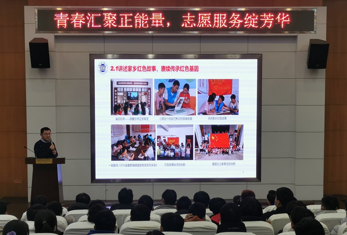 报告会伊始,海尔学院团总支书记丁志健围绕海尔学院2020年度学生社会实践和志愿服务工作作总结汇报,一方面重点围绕“爱心陪伴绘七彩童梦,奉献担当绽青春风采”主题,结合“红、橙、黄、绿、青、蓝、紫”彩虹七色,汇报了2020年夏季学期学校振超先锋志愿服务队赴临沂市沂水县夏蔚镇西社区开展“爱国主义教育、生命与感恩教育、阳光体育运动、生态环保教育、安全自护教育、科学启蒙教育、快乐阅读启蒙”7个模块的关爱留守儿童主题实践活动的成果,另一方面还向同学们介绍了学校在第五届中国青年志愿服务项目大赛获得铜奖的项目——“寻根筑梦—星火计划”志愿服务项目的概况。此外,丁志健还结合校团委发布的《关于开展2020-2021学年冬季学期社会实践活动的通知》相关要求,从实践主题、总体思路、实践内容、实践意义等多个方面详细部署了此次社会实践工作,并向同学们发出了通过社会实践坚定理想信念、站稳人民立场、练就过硬本领、投身强国伟业,在社会实践中受教育、长才干、作贡献的积极号召。
