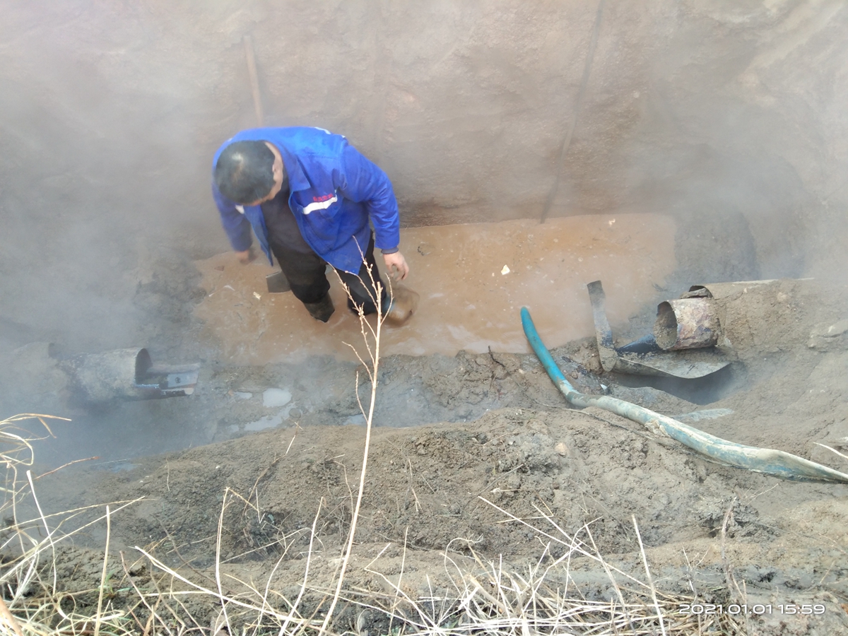 1月1日上午,学校1号供热站一次管线漏水,基建处立即派人到现场查看。现场勘查后,基建处李桂华老师立即联系施工单位启动应急抢修程序,共同制定了抢修方案。在抢修过程中关断一次网阀门,切除腐蚀破裂管线,更换焊接新管线,开闸放水,一次成功,当晚22:00恢复供暖。经过近16个小时的连续奋战,最终完成了供暖管线抢修和地面恢复,保障了师苑小区近400户居民的供暖。(责任编辑 董雷萍)