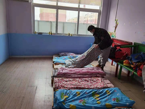 志愿者整理小朋友们的床铺