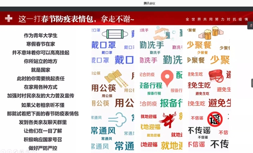 此次线上主题团日活动以重点学习《人人都是防线 战“疫”有你有我——致广大市民朋友们的一封信》为切入点,呼吁全体同学从“我”做起,带头遵守好疫情防控政策法规,带动家人、朋友、同学等身边的每一个人,切实做到主动报备信息、践行健康生活方式、加强自我防护、减少人员聚集、减少非必要出行、安全食用冷冻冰鲜食品、主动做好健康监测、保护隐私拒传谣言,共同做好常态化疫情防控工作。随后,在瀚海书院“学尔时习”大学生网络文化工作室网络思政教育品牌活动《“瀚”你侃一侃》环节,结合近日网络上的舆论热点话题——大连卢书记事件,围绕话题:“如果你是卢书记,该咋办?”进行了线上讨论交流,通过思辨讨论引导同学们树立对潜规则、关系学坚定地说不的坚决态度,呼吁大家一起努力明规矩、树正气,力所能及地参与疫情志愿服务工作。再次,围绕“冬季学期,疫情防控跟我有什么关系”话题,引导同学们客观认识石家庄的这次疫情,暴露出的防疫最薄弱的环节:农村,并呼吁同学们力所能及地去改变农村、乡镇的部分人防控观念相对薄弱的问题,提高父老乡亲的疫情防控意识。最后,还以青年喜闻乐见、易于接受的形式——防疫表情包,对疫情防控要求划重点,督促同学们做到:戴口罩、勤洗手、少聚餐、用公筷、常通风、不传谣、报备行程、避免生吃、就地迎福等。