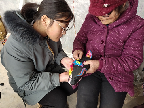 在学习和制作过程中,服务团成员向民间艺人学习了传统虎头帽和编结帽等传统民间手工艺。从帽子的外形样式到针法、贴布等表现手法,老人们手把手地像“师傅带徒弟”一样耐心细致地进行教授,经过创意和制作,一顶顶风格迥异、乡土气息浓厚的特色帽子呈现在大家眼前。
