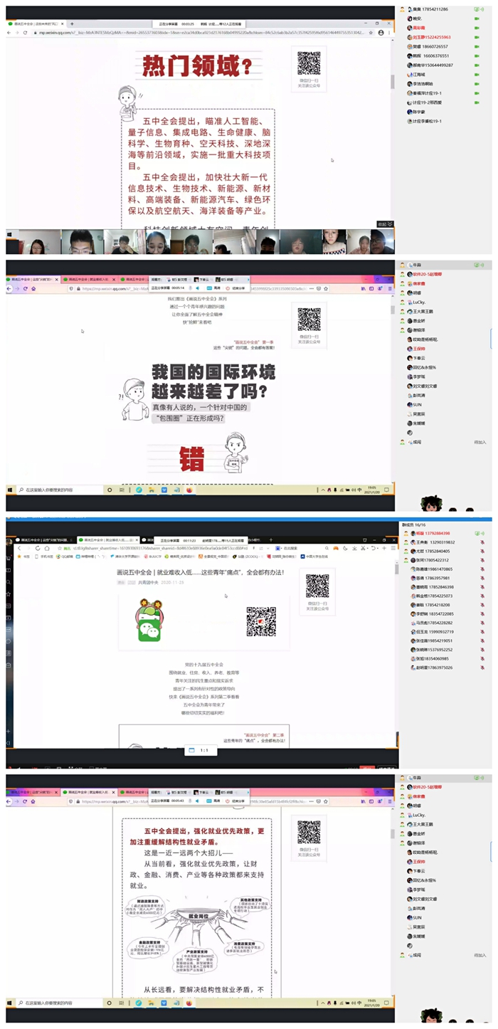 活动中,入党积极分子在各小组长的带领下,根据各自假期可安排时间分组学习领悟了党的十九届五中全会精神并认真开展了讨论。大家通过视频、语音通话等形式贯彻学习了《中国共产党第十九届中央委员会第五次全体会议公报》;通过“画说五中全会”系列漫画,生动形象地理解了五中全会为广大青年带来的切实福利;还围绕“党的十九届五中全会精神”畅所欲言,积极讨论和交流了对党的十九届五中全会胜利召开和《中共中央关于制定国民经济和社会发展第十四个五年规划和二〇三五年远景目标的建议》的学习感悟。同学们表示,作为新时代大学生,要把学习贯彻党的十九届五中全会精神作为当前和今后一个时期的重大政治任务,努力增强“四个意识”、坚定“四个自信”、做到“两个维护”,坚定不移听党话、跟党走,在全面建设社会主义现代化国家新征程中贡献自己的青春力量。
