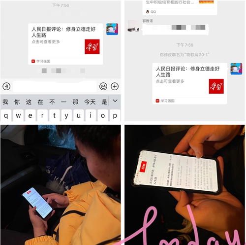 为加强文明修身队伍的建设,积极构建学习型组织,此次活动通过线上宣传文明修身知识以及线上读书分享会的形式进行。活动中,同学们表现出较高的积极性,在线上交流自己的读书感受,推荐自己读过的好书,同时也向身边的家人和朋友推荐经典名著。此外,文明宣传小队的成员还连续在班级群内转发学院颁发的相关文件,普及文明修身小知识,倡导“修身立德体现在一言一行、一举一动当中”的理念,呼吁大家提高自身思想道德修养、锤炼高尚的大学生品质。同时,文明宣传小队的成员们还通过开展线上会议的形式来总结经验、弥补不足,从而更好地引导同学们充分理解文明修身的内在意义,增强学生自觉学习的意识。