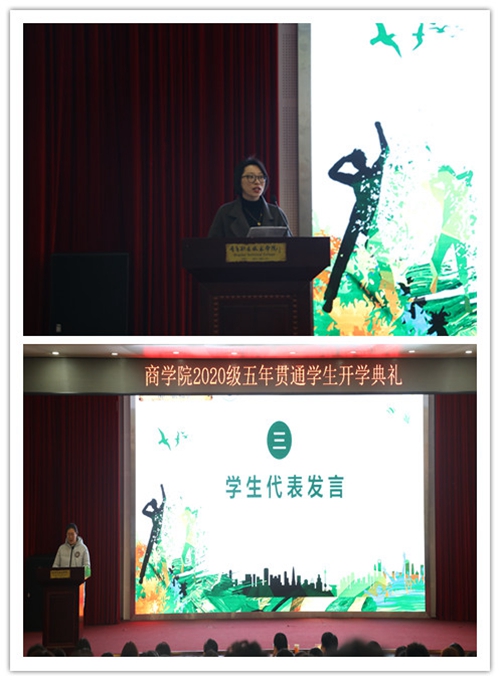 开学典礼伊始,商学院院长、党总支书记邱浩然致欢迎辞,对来自四所中职学校的333名五年制贯通学生入校学习表示热烈欢迎,详细介绍了商学院的专业特色、人才培养模式、师资力量、教学成果等情况,并勉励全体学生牢记专业初心,励志锤炼专业技能,在新的征程上不负青春、不负梦想、奋楫扬帆、砥砺前行,争做有理想、有追求、有担当、有技能、有品质、有修养的新时代商科学子。随后,商学院班子成员、教研室主任分别介绍了各自分管的工作及专业概况,并为五年贯通全体学生送上了新学期开学寄语,表达了商学院全体师生对2020级五年制贯通学生入校学习的期许与希望。来自青岛商务学校物流20-6班的张梦泽同学代表五年制贯通全体学生发言,分享了其初遇青职的激动和兴奋之情,并表示会珍惜在青职学习生活的美好时光,向优秀朋辈榜样和校友学习,努力学好专业知识,练就过硬的专业技能,全面提高综合素养,为未来发展奠定坚实的基础;青岛商务学校辅导员王田田从学会学习、学会做事、学会做人等方面为同学们新学期学习生活提出了建议和希望。