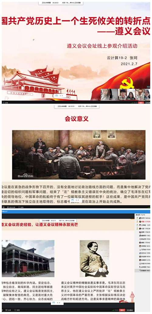根据新冠肺炎疫情防控要求,此次活动主要通过线上开展,组织学生从全国范围内选取红色景点、会议遗址、名人故居等进行“云游”。学生们积极跟随云导游直播进行云参观,通过学习强国等平台游览名胜,建立讨论组交流参观地的经典历史。