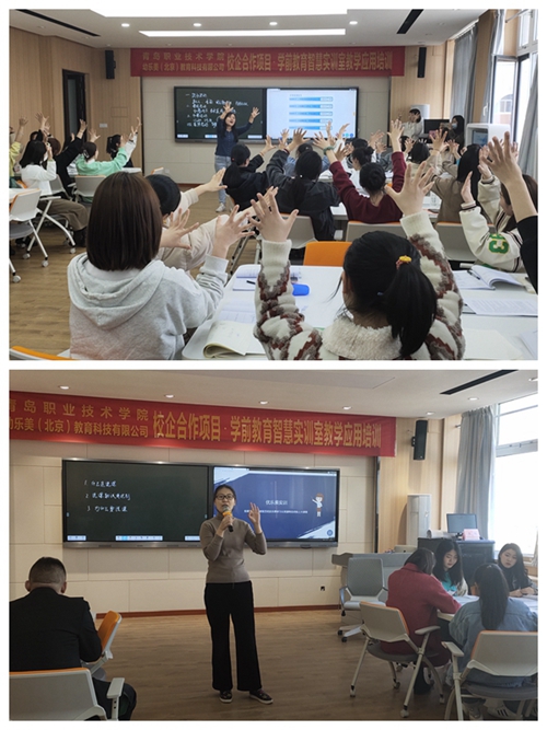 为期一周的培训过程中,幼乐美教育科技有限公司的讲师就学前教育课岗融合实训课程模块的应用和智慧实训室教学方法进行了培训。课程紧密围绕“以学生为中心、学习成果为导向、促进自主学习”的思路,按观摩研讨—工作表单—方案设计—模拟演练—学习支持5个步骤进行。教育学院学前教育专业教师张静静和管玮玮运用所学任务导向式教学方法及智慧实训室教学软件,结合自身专业特长,设计教学模块,开展了示范课展示。学生们纷纷表示,这种以工作任务为导向、以实景演练为呈现方式的自主学习方式,充分调动了大家的学习积极性,让大家更好地体验了职业环境和职业氛围,真正提升了自身综合职业素养和专业技能。