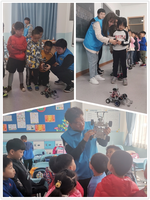 活动中,海尔学院机器人应用与智能制造工作室的志愿者师生以小朋友们喜闻乐见的大黄蜂、擎天柱等动漫机器人形象为切入点,以自主开发制作的三台探索者ROBOT智能小车为载体,用通俗易懂的语言讲解了机器人工作原理,通过实物观摩的形式向小朋友生动形象地介绍了DIY机器人组件构成以及机器人拼装、拆解、编程和操控等的基本的智能科普知识,并指导小朋友们体验了操作手柄和手机蓝牙自主操纵体验小车的智能控制功能。整场活动小朋友们互动踊跃、兴致盎然,通过做中学、学中做的教学形式切实感受到了智能科技的神奇魅力。