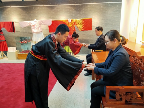 拜师仪式上,旅游学院党总支副书记王媛媛为企业导师颁发了“榜样的力量”导师牌,为合作企业授予了“现代学徒制培养基地”牌匾,14位企业导师为各自的学徒颁发了“荣耀之选”学徒牌,学徒们向各自的导师行拱手礼和敬茶礼。期间,青岛东方影都融创万达文华&嘉华酒店行政助理经理何刚作为合作企业代表发言,青岛西海岸威斯汀酒店前厅经理王艳丽、青岛城阳宝龙福朋喜来登酒店前厅经理黄莹作为导师代表分别发言,学生袁硕作为学徒代表发言。在中华优秀传统文化氛围熏染下的拜师仪式,让所有现场参会人员,重温了祖先的教育智慧,企业、导师和学徒各自找准定位,充满了前进的力量。