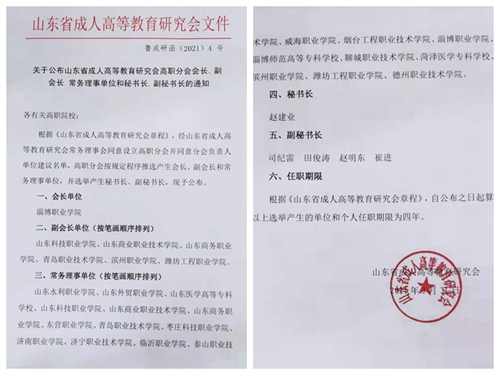 近日,山东省成人高等教育研究会高职分会正式成立,我校被推选为副会长单位,同时培训学院党总支书记田俊涛被推选为副秘书长,任职期限四年。此前,培训学院院长刘勃被推选为山东省成人高等教育研究会副秘书长。