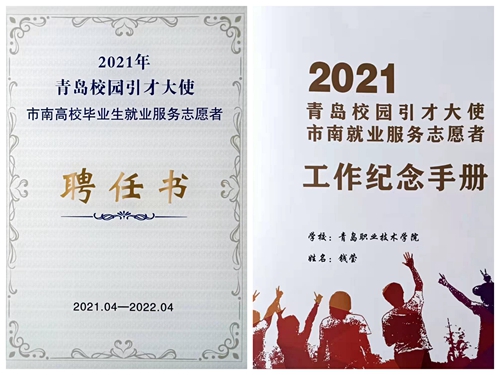 “2021青岛校园引才大使市南就业服务志愿者”聘任书、工作纪念手册