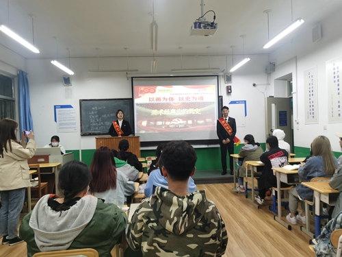 活动中,“青之艺”宣讲团成员以周令钊创作的油画《五四运动》为开端,从五四运动的背景讲起,结合经典油画作品,向同学们讲授了绘画写实手法、色彩对比、构图方法等美术知识。“青之艺”宣讲团成员用自己独特的宣讲方式讲述了五四精神的定义、时代内涵、当代青年如何践行和弘扬五四精神等方面的内容。