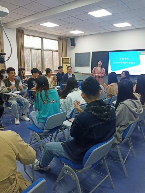 5月12日下午,旅游学院在闻道楼130教室召开2021年春季学期学生座谈会。旅游学院副院长张明洪、党总支副书记董雷萍,相关教师及20余名学生代表参与了此次座谈。