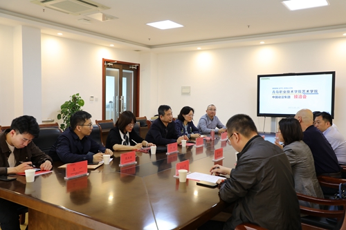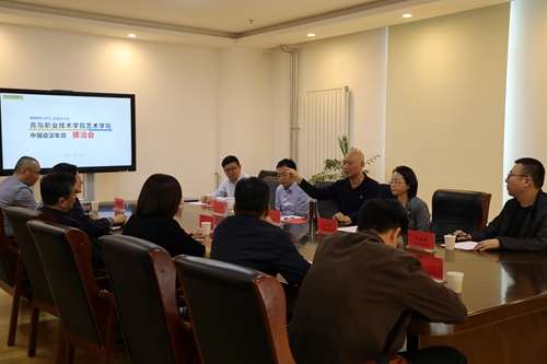 薛玉平对朱步沂一行表示热烈欢迎,并简要介绍了学校概况和发展情况。朱步沂介绍了中国动漫集团国家动漫创意研发中心动漫发展研究院的情况以及校企动漫合作项目。艺术学院院长乔璐介绍了艺术学院的专业情况以及“双高计划”专业群建设情况。双方经过洽谈达成了拟在学校建设首批中国动漫集团国家动漫创意研发中心动漫发展研究院(山东);研究院将采取政校企多方合作的运营模式,以“服务动漫产业、普及动漫文化”为使命,实现六大功能定位;建设中国动漫集团1+X数字艺术创作首批1+X省级师资培训考试点;建设动漫发展研究院职业教育培训指导委员会平台等合作意向。