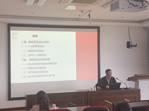 5月26日下午,我校邀请中国职业技术教育学会监事陈建华教授在综合实训楼1002会议室作“职业院校课程思政理论与实践”专题讲座。各相关职能部门和各二级院部负责人及教职工共100余人聆听了此次讲座。副院长薛玉平出席此次讲座。