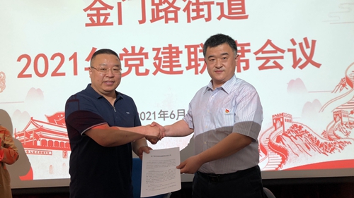 近日,培训学院党总支书记田俊涛应邀出席了金门路街道2021年党建联席会,辖区37家单位的42名代表出席了会议。会上,田俊涛代表培训学院党总支与金门路街道党工委签订了党建联席会协议。