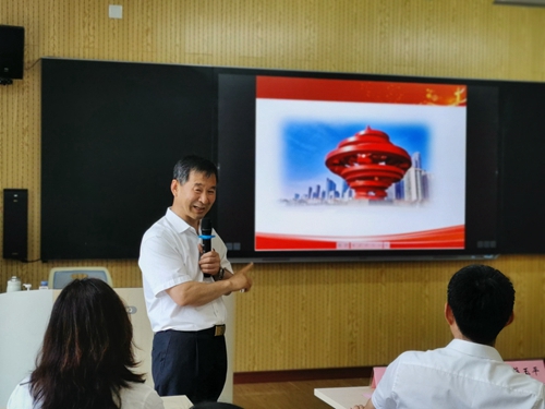 活动中,齐顾涛带领全体党员重温入党誓词。薛玉平向全体党员讲授一堂党课。党课上,薛玉平系统回顾了中国近代史,特别是“五四运动”前中后期的重要事件、重要节点、重要历史人物,全面再现了充满艰辛曲折的青岛发展史。结合习近平总书记在纪念五四运动100周年大会上的重要讲话精神和习近平总书记在庆祝中国共产党成立100周年大会上的重要讲话精神,勉励全体党员师生,特别是青年党员师生,爱党爱国、努力奋斗,为实现中华民族伟大复兴中国梦不懈奋斗。整堂党课,热情洋溢、图文并茂,深入浅出,信息量大,令大家受益匪浅。党课结束后,全体毕业生党员开展了一次美化校园的义务劳动,以回馈和感恩母校。