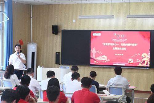7月1日下午,为热烈庆祝中国共产党成立100周年,生物与化工学院党总支与机关党总支后勤服务中心党支部于创意实训楼B-201教室联合举办“党史学习教育庆七一 党徽闪耀毕业季”主题党日活动。我校副院长薛玉平、齐顾涛出席此次活动,生物与化工学院党总支、后勤服务中心党支部师生党员共63人参加活动。