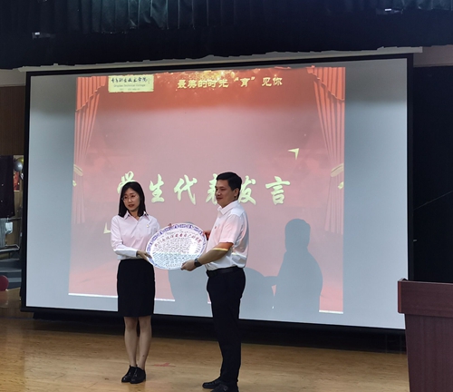 毕业生代表刘燕衡发言并向学院赠送纪念礼物