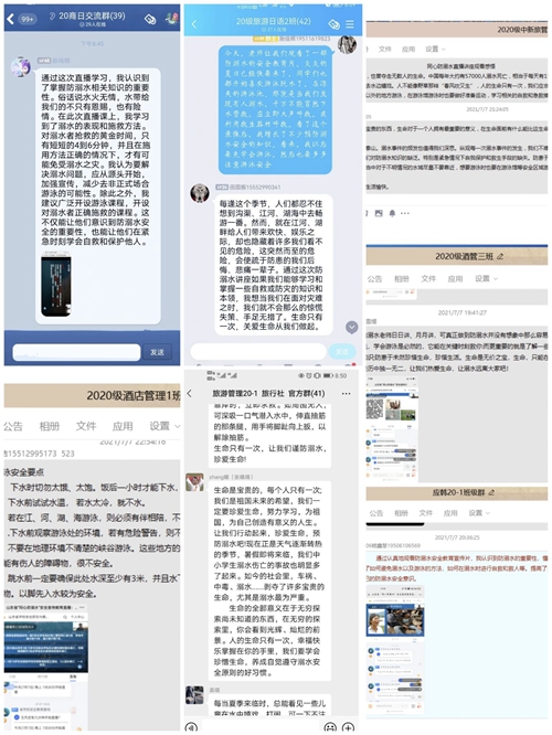 活动中,旅游学院9名辅导员面向7个专业的1200多名学生分别开展了线上防溺水安全教育班会,强调了暑假安全注意事项。随后组织学生认真观看了山东省教育厅发起和组织的“溺水救治 重于泰山”直播讲座。讲座中,学生进一步了解了溺水的概述、溺水的临床表现、溺水的救治策略等方面的防溺水知识。讲座结束后,学生纷纷在班级群里分享了自己的学习感悟,充分认识到了防溺水的重要性。
