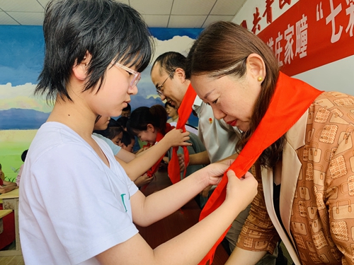 青少年代表为出席活动的领导佩戴红领巾
